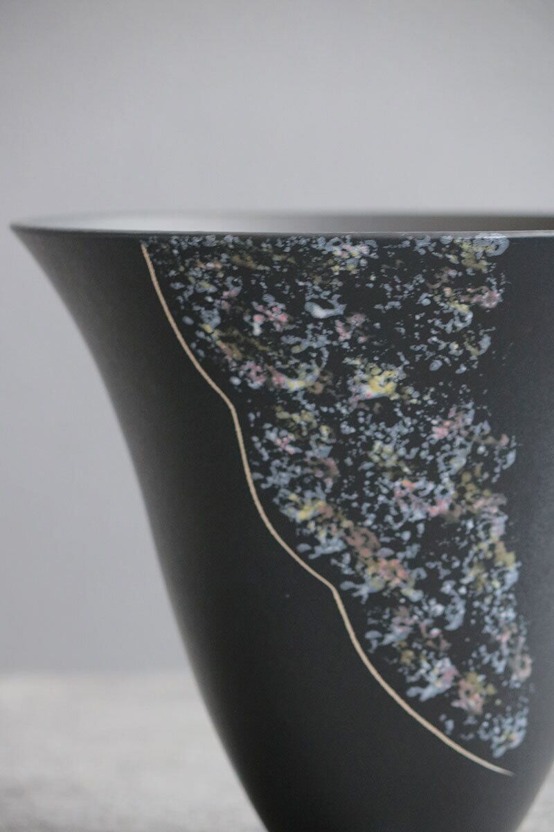 深い色合いのシンプルながらも存在感がある万古焼 花器。お花の種類を選ばず、和洋どちらにも合わせやすい作品です。