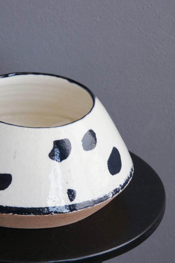 水玉模様がユニークな常滑焼(とこなめやき)の花器。花を飾るとモダンな雰囲気になるデザインです。