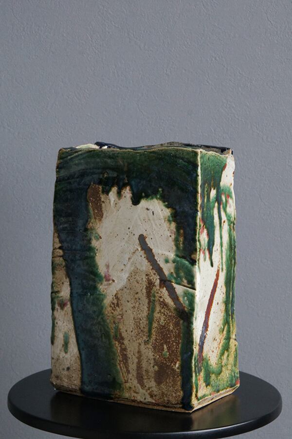 常滑焼 花器。裏表のデザインが異なり、制作した職人さんが「現代の織部焼」というユニークな作品です。