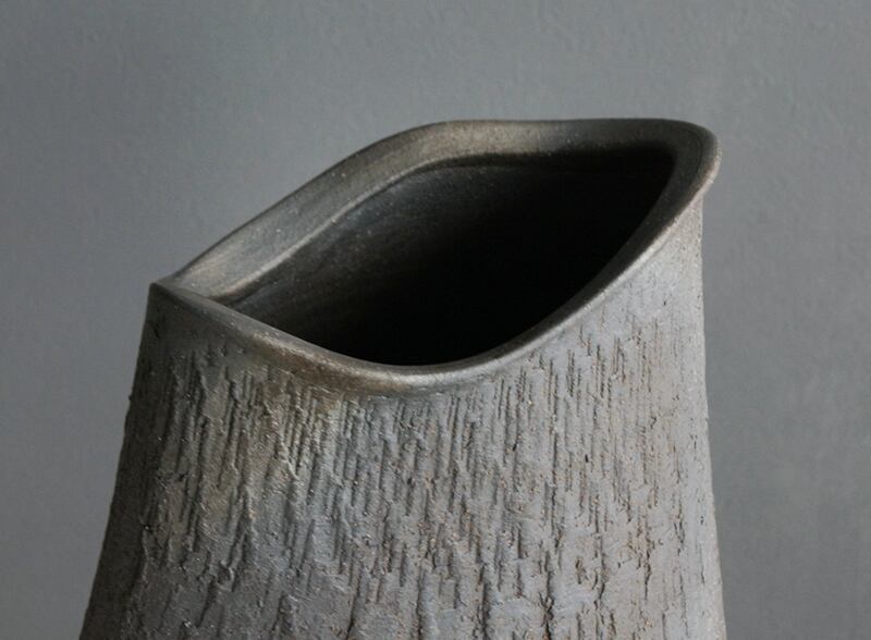 三角らせん模様の投げ入れ信楽焼 花器。モダンなデザインで、洋花にも合う1点物の作品です。