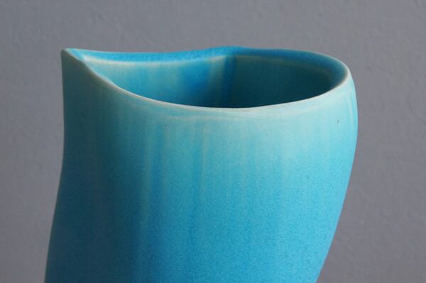 ユニークなシェイプの信楽焼 花器。鮮やかなブルーが目を引くモダンなデザインで、洋花に合う1点物の作品です。