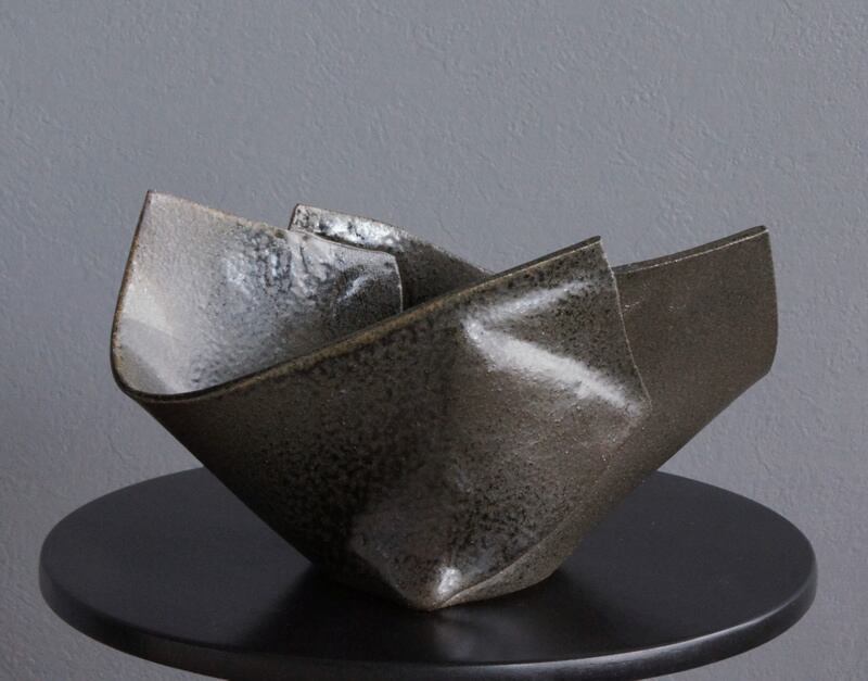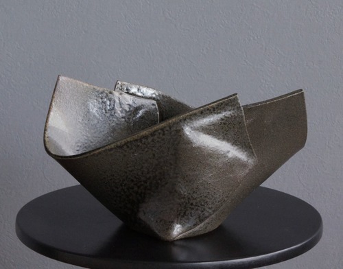 粘土だけれど紙を折ったようにも見えるユニークな形の花器です。インテリアアイテムとしても楽しめる作品です。