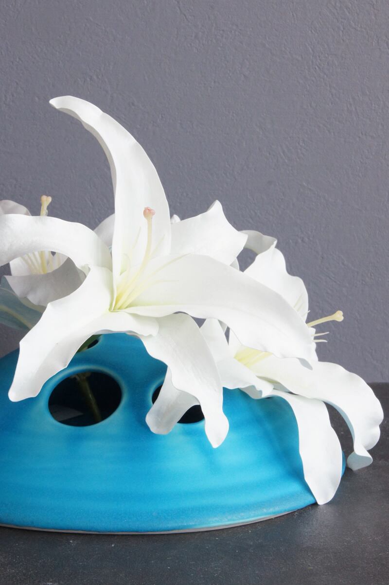 口が5つもあるユニークな1点もの花器です。とても美しいブルーが目を引きます。個性的な花器なので花も飾り方も自由に楽しめます。