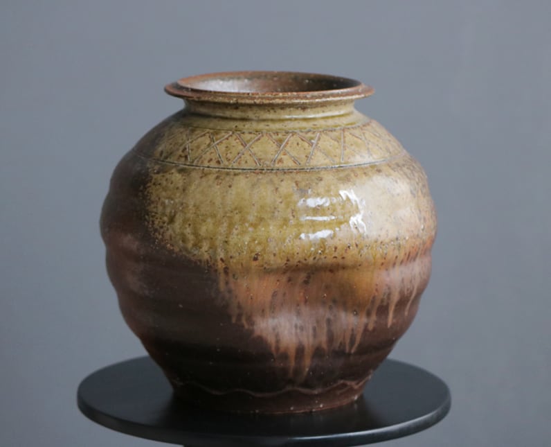 口が大きくたっぷりサイズの壺タイプ花器。どっしりとした重さがあります。